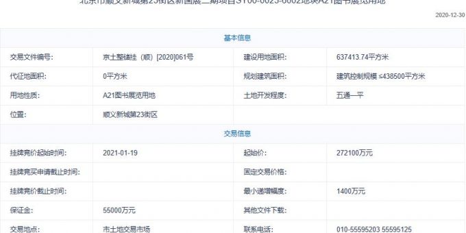 地塊編號京土整儲掛(順)[2020]061號,地塊名稱為北京市順義新城第23街區新國展二期項目SY00-0023-6002地塊,建設用地面積63.74萬平,規劃建築面積 ≤438500平方米,土地用途為A21圖書展覽用地,地塊位於順義新城第23街區,起始價27.21億元。