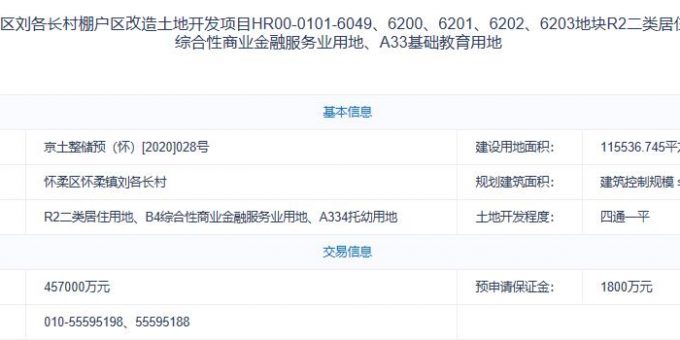 地塊編號京土整儲預(懷)[2020]028號,地塊名稱為北京市懷柔區劉各長村棚戶區改造土地開發項目HR00-0101-6049、6200、6201、6202、6203地塊,建設用地面積11.55萬平,規劃建築面積≤ 211725平,地塊位於懷柔區懷柔鎮劉各長村,土地用途為R2二類居住用地、B4綜合性商業金融服務業用地、A334托幼用地,起始價45.7億元。