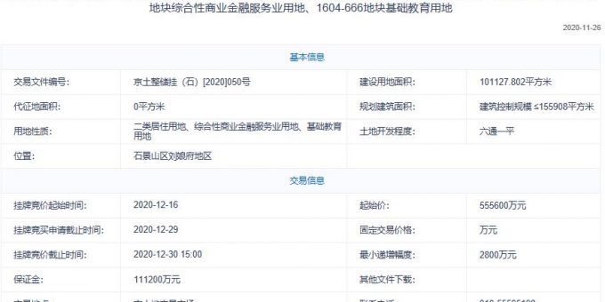 地塊編號京土整儲掛(石)[2020]050號,地塊名稱為北京市石景山區劉娘府綜合改造A2地塊土地一級開發項目1604-663、1604-667地塊,建設用地面積10.11萬平,規劃建築面積≤155908平方米,土地用途為二類居住用地、綜合性商業金融服務業用地、基礎教育用地,起始價55.56億元。