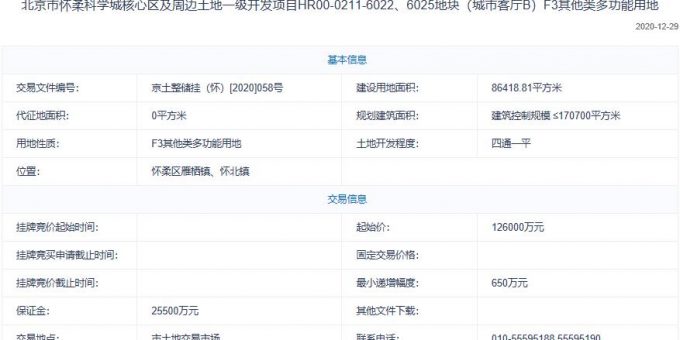 地塊編號京土整儲掛(懷)[2020]058號,地塊名稱為北京市懷柔科學城核心區及周邊土地一級開發項目HR00-0211-6022、6025地塊,建設用地面積8.64萬平,規劃建築面積≤170700平方米,土地用途為F3其他類多功能用地,地塊位於懷柔區雁棲鎮、懷北鎮,起始價12.6億元。