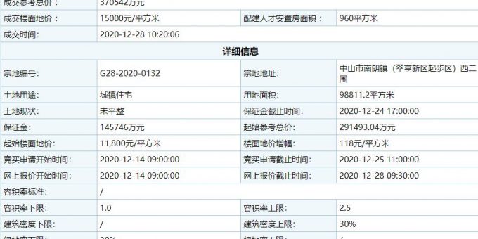 中國網地產訊 12月28日,廣東中山1宗住宅用地成功出讓,最終粵海集團以37.05億元競得,樓麵價15000元/平方米,配建人才安置房面積960平方米,溢價率27.1%。