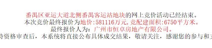中國網地產訊 12月28日,廣州7宗地塊集中出讓,其中包括4宗涉宅用地,總起始價114.33億元。最終廣州市恆卓有限公司()以58.11億元競得番禺區亞運大道北側番禺客運站地塊,競配建面積6750平方米,溢價率45%。