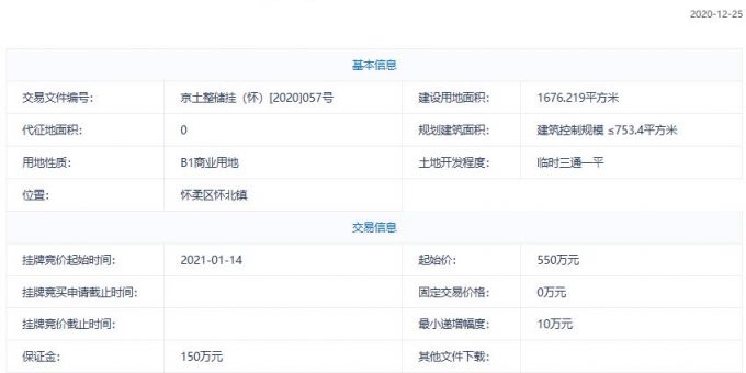 地塊編號京土整儲掛(懷)[2020]057號,地塊名稱為北京市懷柔區懷北鎮雁柏山莊北側地塊,建設用地面積為1676.219平方米,規劃建築面積≤753.4平方米,土地用途為B1商業用地,起始價550萬元。
