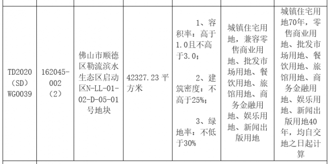 資料显示,該地塊編號為TD2020(SD)WG0039,位於順德區勒流濱水生態區啟動區N-LL-01-02-D-05-01號地塊。出讓面積42327.23㎡,起始價63491萬元,競買保證金12699萬元,建築密度≤25%,率≥30%,建築高度≤100米。