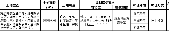 資料显示,該地塊位於新洲區陽邏開發區袁榨村、黃土村,潘廟二路以南、機場路以東、金台路以西、干叉湖路以北。出讓面積96947.17㎡,起始價54020萬元,競買保證金10804萬元。