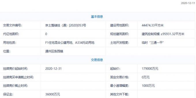 地塊編號京土整儲掛(通)[2020]053號,地塊名稱為北京城市副中心0302街區FZX-0302-6004、6002地塊,建設用地面積4.45萬平,規劃建築面積≤95931.32平方米,土地用途為F1住宅混合公建用地、A334托幼用地,地塊位於通州區梨園鎮,起始價17.9億元。