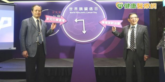 中華民國癌症醫學會理事長陳立宗(左)與台灣胰臟醫學會理事長葉大森(右)在世界胰臟癌日鼓勵患者積極治療。