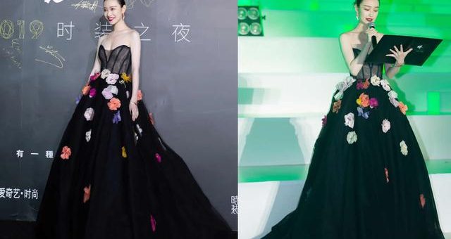 ▲這是出席時尚雜誌活動時穿的黑色抹胸禮服長裙,這條黑色的裙子非好看,胸口的造型如蝴蝶,裙擺上綴滿大朵的立體花朵,浪漫甜美又大氣高貴。頭髮簡單的盤起來,大紅唇很搶鏡,優雅又有女人味,很有魅力。