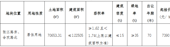 資料显示,該地塊位於張江路東、合歡路北。出讓面積70653.31㎡,起始價52212.8萬元,建築密度≤15%,率≥35%,建築高度≤60米。
