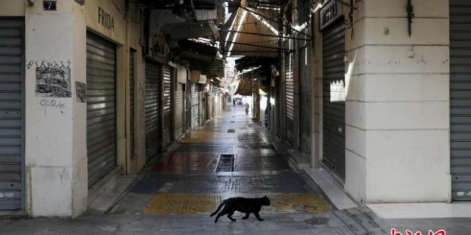 - 資料圖:當地時間11月7日,希臘雅典,一隻貓在空蕩的商業街上漫步。