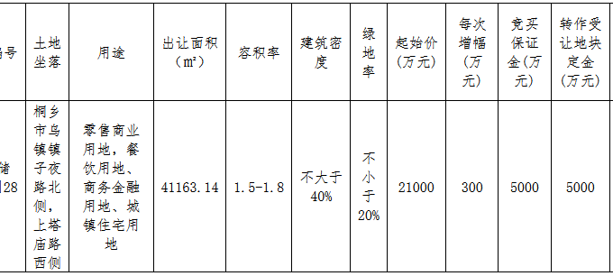 資料显示,該地塊編號為桐土儲[2020]28號,位於桐鄉市烏鎮鎮子夜路北側,上塔廟路西側。出讓面積41163.14㎡,起始價2.1億元,競買保證金5000萬元,最高限價3.15億元,建築密度≤40%,率≥20%,建築高度。