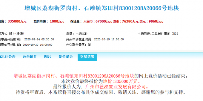 資料显示,該地塊編號為83001208A20066號,位於增城區荔湖街羅崗村、石灘鎮鄭田村。出讓面積124209.97㎡,起始價33.5億元,競買保證金6.7億元。