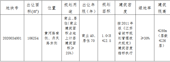 資料显示,該地塊位於黃河路南側、丹鳳路東側。出讓面積106254㎡,起始價79690.5萬元,競買保證金2億元,建築密度,率≥30%,建築高度≤80米(層數≤26層)。