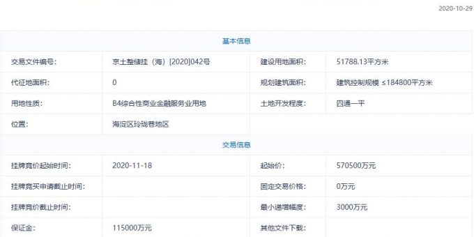地塊編號京土整儲掛(海)[2020]042號,地塊名稱北京市海淀區西八里庄0711-652、640、641地塊,建設用地面積5.18萬平,規劃建築面積≤184800平方米,地塊位於海淀區玲瓏巷地區,土地用途為B4綜合性商業金融服務業用地,起始價57.05億元。