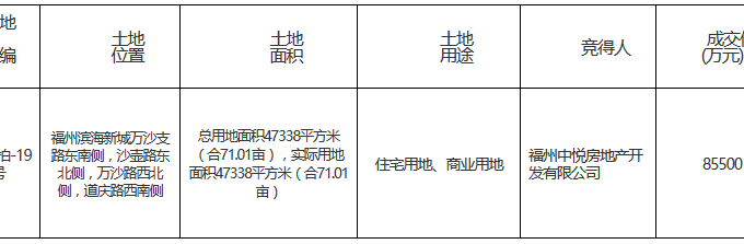 福州中悅開發有限公司(保利)8.55億元競得,溢價率14%。