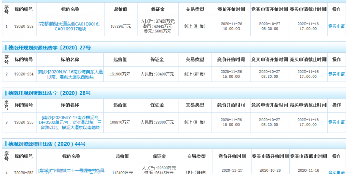 2020NJY-16地塊公告號為穗南開規劃資源出告字〔2020〕27號,位於南沙灣英東大道以南、港前大道以西。土地面積30623㎡(DN0501030地塊14201㎡,DN0501031地塊16422㎡),計容建築面積≤101056㎡(DN0501030地塊≤46863㎡、DN0501031地塊≤54193㎡),起始價151960萬元,最高限價201820萬元,競買保證金3.04億元,增加幅度1500萬元,將於11月26日開始限時競價。