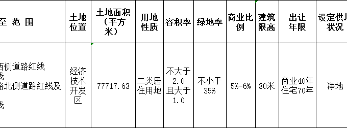 資料显示,該地塊編號為JK2020-008,位於經濟技術開發區,東至六號街西側道路紅線,西至規劃綠線,南至十四號路北側道路紅線及用地界線,北至用地界線。出讓面積77717.63㎡,競買保證金1.3億元,率≥35%,建築高度80米。