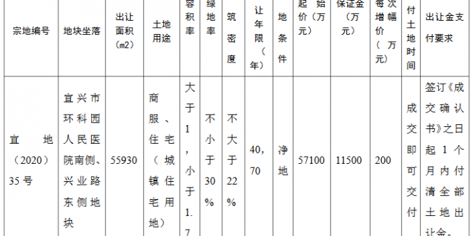 資料显示,該地塊編號為宜地(2020)35號,位於宜興市環科園人民醫院南側、興業路東側。出讓面積55930㎡,起始價5.71億元,競買保證金1.15億元,建築密度≤22%,率≥30%。