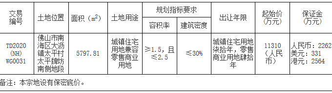 資料显示,該地塊位於南海區大瀝鎮太平村太平牌坊南側地段。出讓面積5797.81㎡,起始價11310萬元,競買保證金2262萬元,建築密度≤30%,率≥30%。