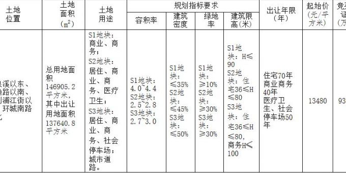 地塊編號金市土讓告字[2020]23號,地塊名稱金華經濟技術開發區山嘴頭未來社區地塊,出讓面積13.76萬平,用途為商住用地,容積率2.96,建築面積40.81萬平,起始價18.55億元。