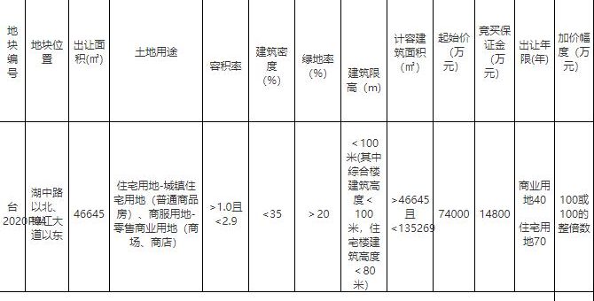 地塊編號台2020P04號,地塊位於角美湖中路以北、錦江大道以東,出讓面積4.65萬平,建築面積13.52萬平,容積率大於1小於2.9,土地用途為住宅、商服用地。