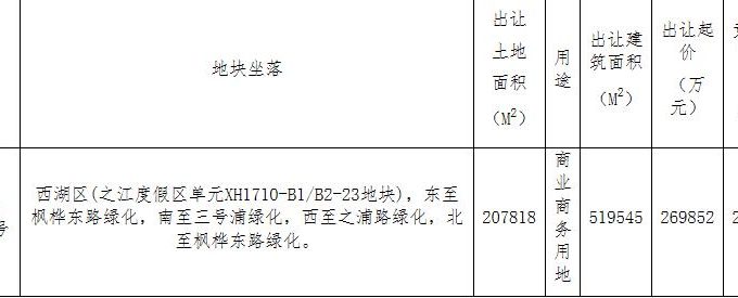 地塊編號杭政儲出[2020]67號,地塊名稱為西湖區(之江度假區單元XH1710-B1/B2-23地塊),出讓面積20.78萬平,用途為商業用地,容積率2.5,建築面積51.95萬平,起始價26.98億元。