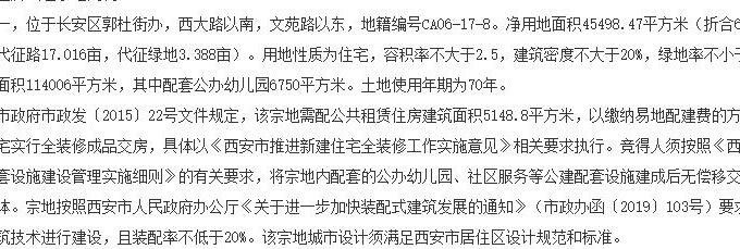 地塊編號CA06-17-8號,地塊位於長安區郭杜街辦,西大路以南,文苑路以東,凈用地面積45498.47平方米(摺合68.248畝,不含代征路17.016畝,代征3.388畝)。用地性質為住宅,容積率不大於2.5,建築密度不大於20%,綠地率不小於35.0%。地上建築面積114006平方米,其中配套公辦幼兒園6750平方米。土地使用年期為七十年。