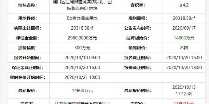 中國網地產訊 10月21日,南京5宗地塊集中出讓,總起始價66.15億元。最終江蘇順信開發有限公司以1.48億元競得,樓麵價1734.28元/平。
