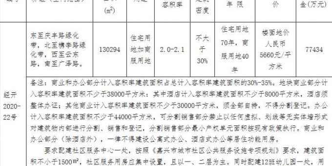 地塊編號經開2020-22號,地塊名稱經開2020-22號地塊,出讓面積13.02萬平,用途為商住用地,容積率2.1,建築面積27.36萬平,起始價15.48億元。