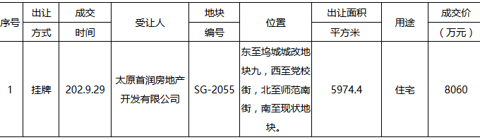 公告显示,太原首潤開發有限公司(+)以8060萬元再受讓塢城村地塊,溢價率12.57%,該地塊為純住宅用地。