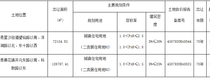 中國網地產訊  10月16日,湖南省市長沙縣以網上掛牌方式集中出讓2宗居住用地,總出讓面積198952.24㎡,總起始價86156萬元,總成交價99841萬元。
