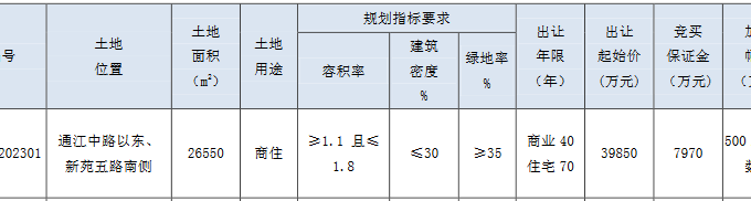 資料显示,該地塊位於新北區龍虎塘街道,通江中路以東、新苑五路南側、澡港河東支以北。出讓面積26550㎡,起始價39850萬元,競買保證金7970萬元,建築密度≤30%,率≥35%,建築高度≤60米。