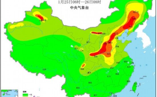 人民網北京1月25日電(馮粒)中央氣象台消息,25日至26日白天,受弱冷空氣影響和降水共同影響,黃淮南部、江漢北部等地的霾天氣將明顯消散,但華北中南部、黃淮西部、陝西關中等地霾天氣將緩慢減弱或維持。26日夜間至28日,華北中南部、黃淮西部、汾渭平原、東北中南部等地大氣擴散條件再次轉差,有輕到中度霾,局地重度霾。此外,25日早晨至上午,陝西關中、內蒙古中部、河南西北部等地的部分地區有大霧天氣,局地有能見度不足200米的強濃霧。