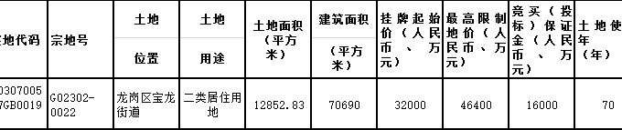 資料显示,該地塊位於寶龍街道。出讓面積12852.83㎡,起始價32000萬元,競買保證金16000萬元。
