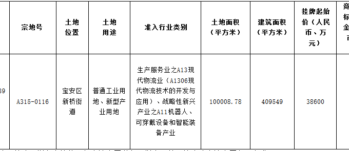 出讓文件显示,本次出讓宗地須自《出讓合同》簽訂之日起一年內開工,四年內竣工。可獨立申請競買,競買申請人為深圳註冊的企業法人;競買申請人符合《深圳市工業及其他產業用地供應管理辦法》(深府規〔2019〕4號)里規定的遴選要求,並通過寶安區重點產業項目遴選。