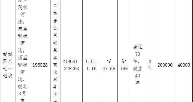地塊編號紹市自然告字[2020]51號,地塊名稱越城區八七一地塊,出讓面積19.68萬平,用途為商住用地,容積率1.16,建築面積22.82萬平,起始價20億元。