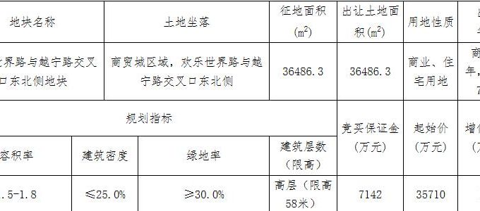 地塊編號諸市自然告字[2020]31號,地塊名稱歡樂世界路與越寧路交叉口東北側地塊,出讓面積3.64萬平,用途為商住用地,容積率1.8,建築面積6.56萬平,起始價3.57億元。