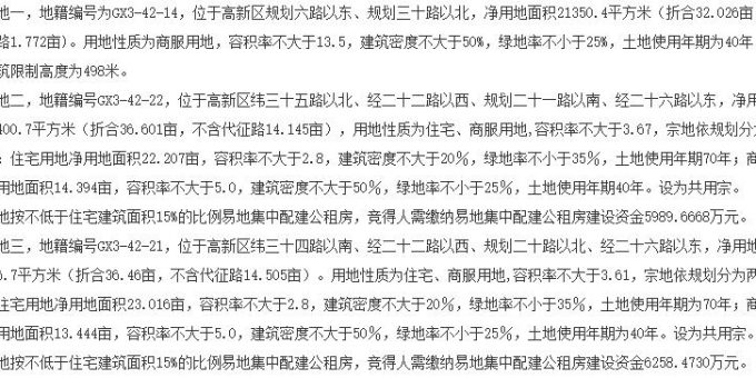 地塊編號GX3-42-22,位於高新區緯三十五路以北、經二十二路以西、規劃二十一路以南、經二十六路以東,凈用地面積24400.7平方米(摺合36.601畝,不含代征路14.145畝),用地性質為住宅、商服用地,容積率不大於3.67,宗地依規劃分為兩個地塊:住宅用地凈用地面積22.207畝,容積率不大於2.8,建築密度不大於20%,綠地率不小於35%,土地使用年期七十年;商服用地凈用地面積14.394畝,容積率不大於5.0,建築密度不大於50%,綠地率不小於25%,土地使用年期四十年。設為共用宗。
