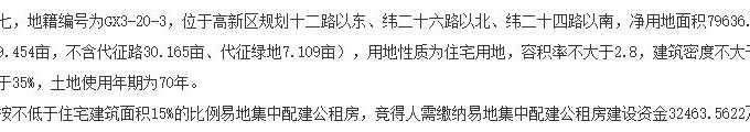 地塊編號為GX3-20-3,位於高新區規劃十二路以東、緯二十六路以北、緯二十四路以南,凈用地面積79636.3平方米(摺合119.454畝,不含代征路30.165畝、代征7.109畝),用地性質為住宅用地,容積率不大於2.8,建築密度不大於20%,綠地率不小於35%,土地使用年期為七十年。