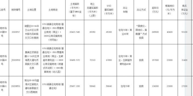 地塊編號2020P07,地塊位於廈門湖裡區呂嶺路與雲頂中路交叉口東南側,土地面積20424㎡,計價建築面積65300㎡,起拍樓麵價40400元/㎡,土地用途為0701城鎮住宅用地(普通住宅);0501零售商業用地(商業);0809公用設施用地(環網站),起拍總價26.55億元。