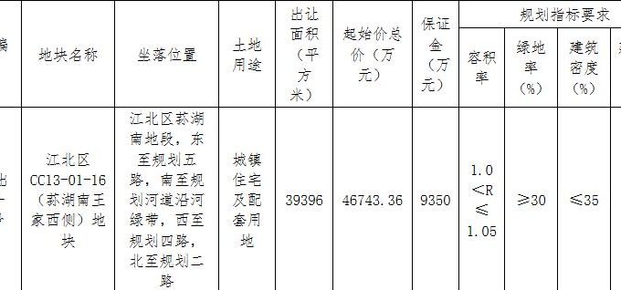 地塊編號甬儲出2020-114號,地塊名稱江北區CC13-01-16(蓀湖南王家西側)地塊,出讓面積3.93萬平,用途為住宅用地,容積率1.05,建築面積4.13萬平,起始價4.67億元。