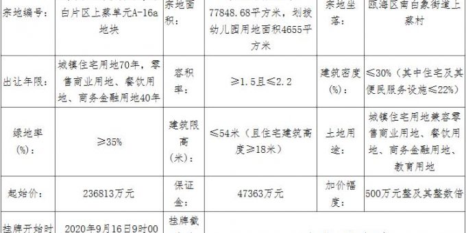 地塊編號溫政務中心土告字〔2020〕93號,地塊名稱溫州市生命健康小鎮茶白片區上蔡單元A-16a地塊,出讓面積7.78萬平,用途為商住用地,容積率為2.29,建築面積17.83萬平,起始價23.68億元。
