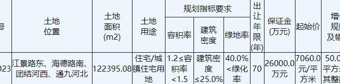 地塊編號R20023,地塊名稱江景路東、海德路南、團結河西、通九河北地塊,出讓面積12.23萬平,用途為住宅用地,容積率1.47,建築面積18萬平,起始價8.64億元。