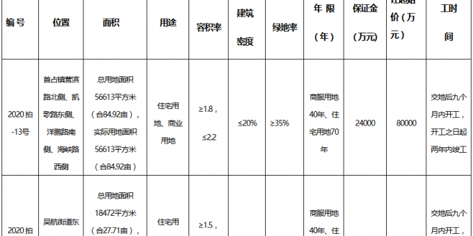 資料显示,該地塊位於首占鎮營濱路北側、凱歌路東側、洋鵬路南側、海峽路西側。實際用地面積56613㎡,起始價8億元,競買保證金2.4億元,建築密度≤20%,率≥35%。