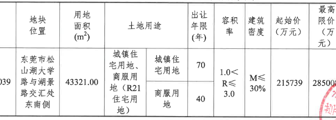資料显示,該地塊編號為2020WR039號,位於松山湖大學路與湖景路交匯處東南側。出讓面積43321㎡,起始價215739萬元,競買保證金43150萬元,最高限價285008萬元,建築密度≤30%。