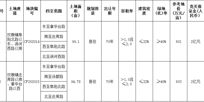 資料显示,該地塊位於雙墩鎮阜陽北路以東、渦河西路以南,東至章華台路、南至莊周路、西至阜陽北路、北至渦河西路。出讓面積99.1畝,起始價59559.1萬元(601萬元/畝),競買保證金2億元,建築密度≤22%,率≥40%。