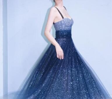 形象造型師——Ethan:Angelababy身穿藍色弔帶裙清新又少女,造漸變深藍色弔帶連衣裙配上楊穎白皙的皮膚,簡約的盤發讓視線的重點完全集中在了這條星光璀璨的裙子本身。