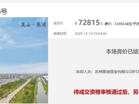 上坤7.28億元競得蘇州崑山1宗住宅用地