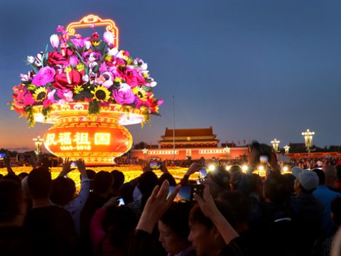 天安門廣場拍攝花籃的遊客。 北京什剎海遊人川流不息…