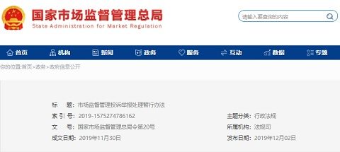 《市場監督管理投訴舉報處理暫行辦法》發布 2020年1月1日起施行